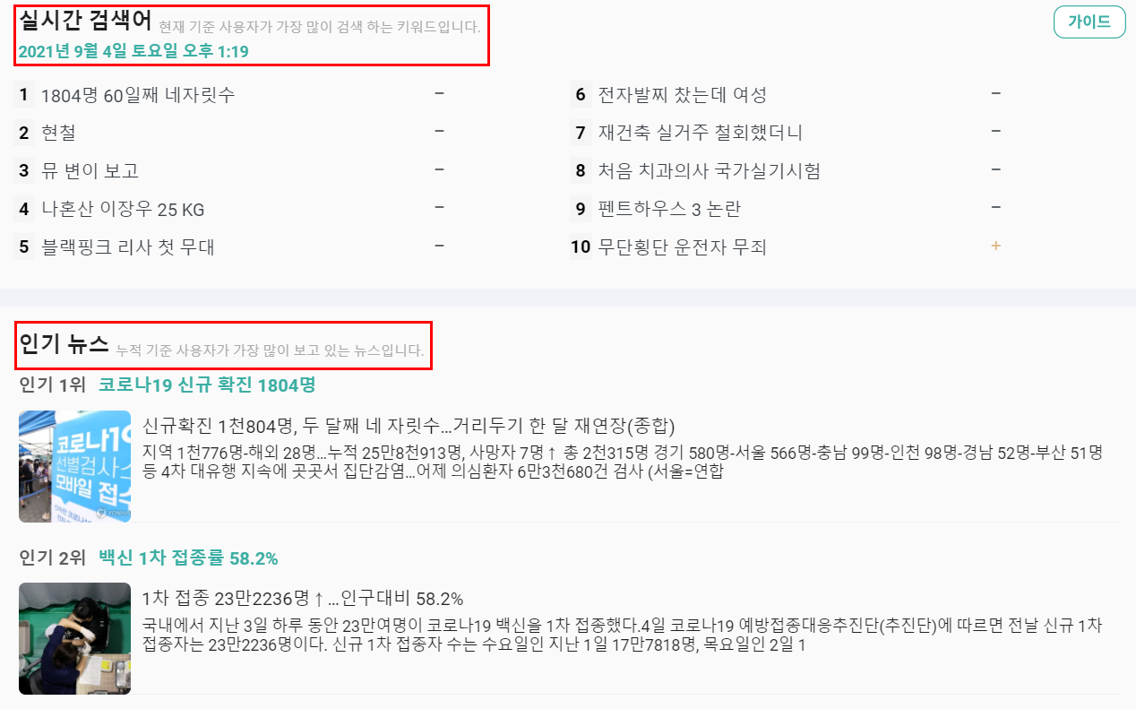 검색어 순위는 분단위로 바뀌고 있으며, 인기뉴스는 검색량에 따라 변경되고 있습니다.