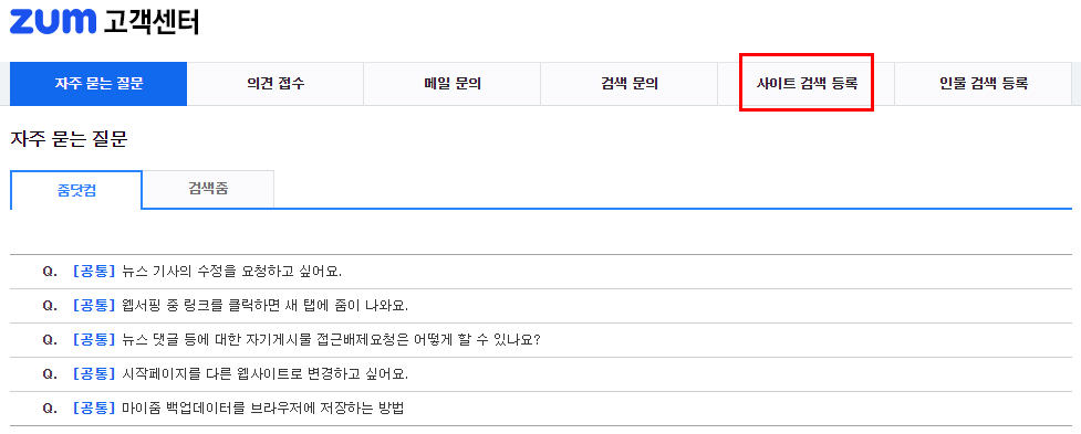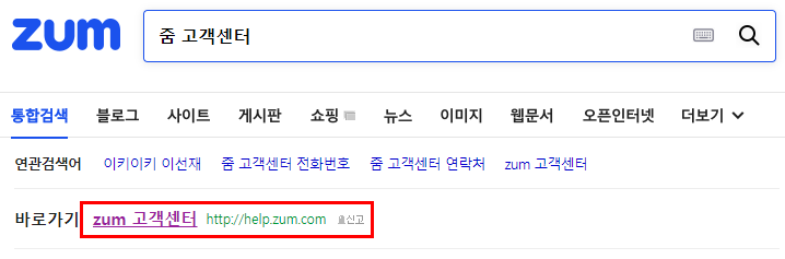 검색 상단에 zum고객센터 홈페이지 바로가기가 나오며 클릭하여 줌 고객센터 사이트로 접속합니다.
