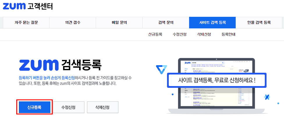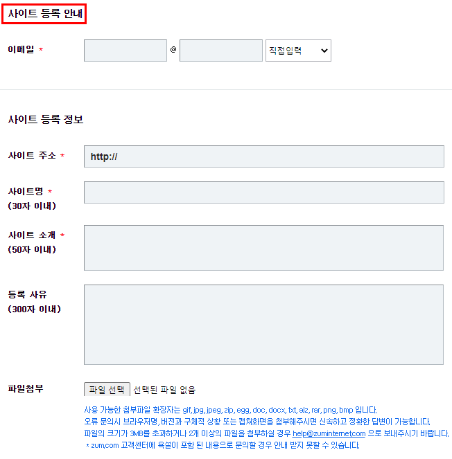 네이버 및 구글을 제외하고 또 다른 포털사이트인 줌에서도 사이트 등록이 가능합니다.
