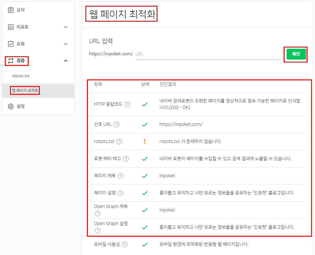 검증 - 웹 페이지 최적화에서 확인이 가능합니다.