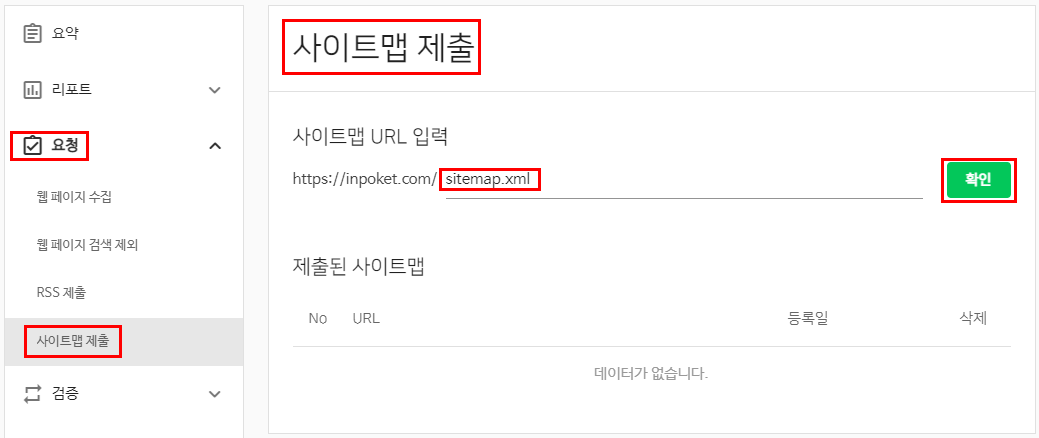 정상적으로 입력하셨으면 RSS 제출과 동일하게 확인을 눌러주면 제출이 완료됩니다.