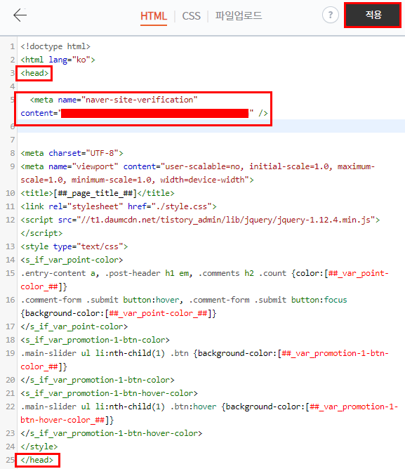 복사한 메타태그는 티스토리 스킨설정에서 설정해줘야 합니다.