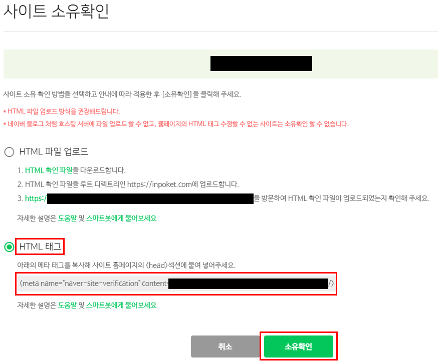 그 다음에 다시 네이버 서치어드바이저 사이트 소유확인으로 돌아와 소유확인 버튼을 눌러줍니다.