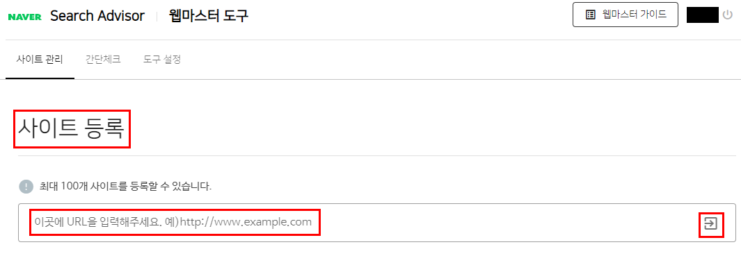 웹마스터 도구를 클릭 후 위 이미지처럼 사이트 등록화면이 나옵니다.