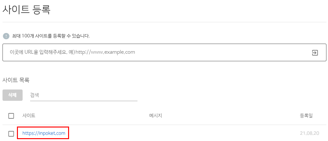 보안코드를 입력 후 '사이트 소유 확인되었습니다' 라는 메세지박스가 노출되며 정상적으로 등록이 완료됩니다.